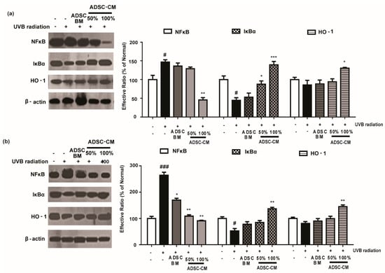 The effects of ADSC-CM on UVB-induced NF-κB/HO-1 activation in HaCaTs (a) and NHDFs (b). HaCaTs and NHDFs were irradiated with UVB, followed by treatment with 50% or 100% ADSC-CM for 2 h, respectively. The levels of NF-κB, IκBα, and HO-1 were measured using western blotting. The band intensities were quantified with densitometry and calculated as a percentage of the basal response. The results are shown as the mean ± SD of at least three independent experiments. # p < 0.05 and ### p < 0.001, compared with the non-irradiated control. * p < 0.05, ** p < 0.01, and *** p < 0.001, compared with the irradiated, ADSC-CM free control.