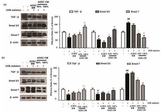 As shown in Figure 7, UVB irradiation caused a decrease in the expression levels of TGF-β and Smad 2/3 proteins. Following the treatment with ADSC-CM, the expression of these proteins were increased in a dose-dependent manner. In particular, 100% ADSC-CM treatment recovered the expression of TGF-β and Smad to those in the non-irradiated control (Figure 7). It was found that UVB irradiation upregulated Smad 7 expression and that 100% ADSC-CM treatment reduced UVB-induced upregulation of Smad 7 by 59.2% in the HaCaT group. Similar results were found in NHDF cells for the photoprotective effects of ADSC-CM (Figure 7).