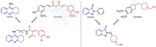 Commercial drugs like donepezil, rivastigmine, galantamine, and tacrine have demonstrated efficacy in the treatment of patients with a mild-to-moderate AD, although the therapeutic use of tacrine has been discouraged due to its hepatotoxicity effects []. Generally, these drugs bind at a specific point of the active site, but recent research is looking for compounds having an action at several points of the active site in order to increase their bioactivity. Seeking to obtain new compounds that can recognize more than one binding spot in the same therapeutic target, tacrine, galantamine, and donepezil have been used as scaffolds to produce a new series of hybrid compounds for improving the inhibitory activity against cholinergic enzymes, and at the same time, improve their pharmacological properties [,,,]. Curcumin–tacrine hybrids have been synthesized as multifunctional compounds that interact with the catalytic active site and the peripheral anionic site of AChE, showing positive inhibitory effects even more potent than individual tacrine []. Similarly, the synthesis of molecular hybrids from donepezil and ebselen, a drug capable of inhibiting iron-induced tau phosphorylation, has been described. The new hybrid compounds showed good dual inhibitory activity against AChE and BChE []. Thus, the molecular hybridization synthetic approach can be applied to obtain new molecules from the combination of two or more pharmacophoric structures that are present in bioactive compounds [] (Figure 1).