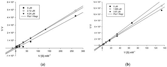 Based on the previously obtained results, and with the aim to assess the kinetic model of AChE/BChE inhibition of the target compounds, the most active compounds 5n and 6aa were subjected to kinetics studies. For this purpose, the rate of enzyme activity was measured at eight different concentrations of substrate ATC/BTC. The obtained Michaelis–Menten parameters along with the Lineweaver–Burk plots allow us to conclude that the compound 5n (Figure 2a) displayed a mixed-type inhibition against AChE with variation in Km and Vmax values. However, the compound 6aa (Figure 2b) showed a competitive type inhibition against BChE with variation in Km values.