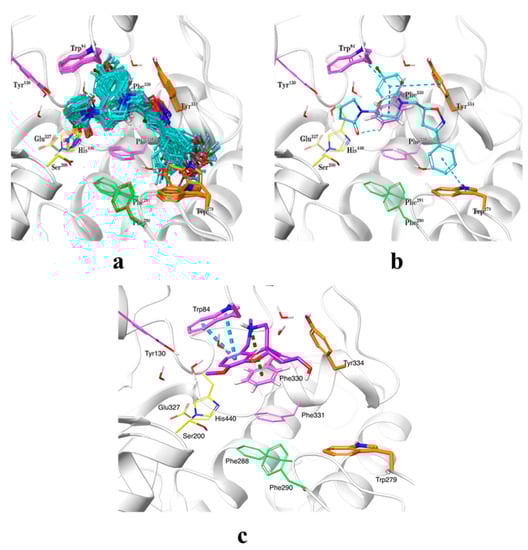 The active site of AChE (CAS) is composed of a catalytic triad (Ser-His-Glu), found at the bottom of ~20 Å deep gorge lined by a high presence of aromatic residues [], and another binding site named the peripheral anionic site (PAS) that is located at 18 Å away from the active site []. BChE is an enzyme with a supportive role in the cholinergic process. It has received important attention because once it is inhibited, cognitive functions are improved []. Although AChE and BChE share some structural similarities, including the presence of a catalytic center within the gorge, ligand binding modes of BChE differ significantly from those of AChE due to the absence of some aromatic residues located mainly in the acyl binding pocket at midgorge. Thereby, different compounds can specifically inhibit one of those enzymes, or they are also able to exert a dual binding action, depending on amino acid recognition and interactions generated within the active site [,].