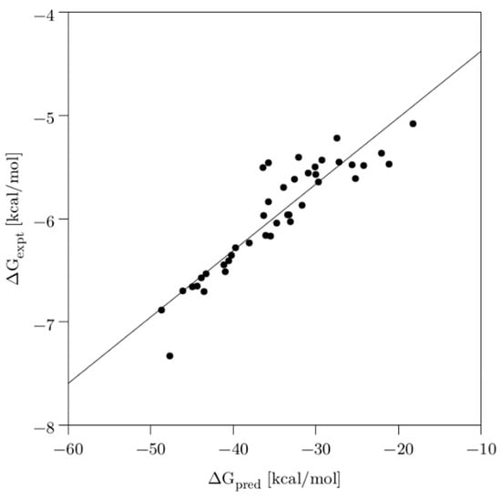 Similarly, the predicted free binding energies (∆Gpred) through the MM/GBSA method agreed well with the experimental energies (∆Gexpt, converted from the IC50 values), showing a good correlation (R2 = 0.83), as evidenced in Figure 4. More importantly, the most and least active compounds were correctly ranked among the 40 compounds.