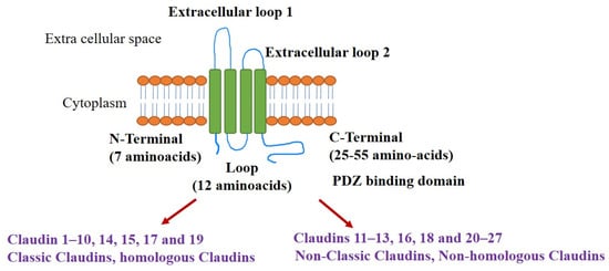 The structure of claudins is comprised of four transmembrane domains, the intracellular N and C termini, and the two extracellular loops (ECLs). The claudin structure encompasses N-termini (7 amino acids), C-termini (25–55 amino acids), and loops containing 25–55 aminoacids. The ECLs are involved in barrier and pore formations. There are two ECLs, ECL1 consists of ~50 amino acids with two conserved cysteines involved in the barrier function. Negative and positive charges in ECL1 contribute to pore formation. The schematic representation of the structure of claudins and its classification is depicted (Figure 1). The ECL2 is responsible for homo and heterotypic interactions and was recently shown to be involved in host cell binding and cytotoxicity for the Clostridium perfringens enterotoxin. The ECL2 usually has ~25 amino acids, but fewer in claudin-11 and more in claudin-18 [16]. Claudins interact with other TJ-associated proteins through carboxy-terminal tails, which contain a PDZ-domain binding motif [17].