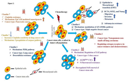 The central role of claudins in the regulation of epithelial to mesenchymal transition (EMT), cancer stem cells, and chemoresistance in various cancers.