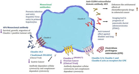 So far, over 100 monoclonal antibody (mAb) products are in clinical trials [113]. In an oncology setting, these monoclonal antibodies can mediate antibody-dependent cellular cytotoxicity (ADCC) and complement-dependent cytotoxicity (CDC) against cancer cells [114]. There is a long-lasting history of antibody-mediated targeting of claudin-1 against hepatitis C virus (HCV) infections, and wherein many researchers have provided proof for the importance of claudins in HCV infections as viral entry point [115,116]. A study by Fofana et al. [117] designed monoclonal antibodies against claudin-1 to combat HCV entry. It was promising to see the antibodies raised against claudin-1 was able to block HCV entry. A recent study by Colpitts et al. has documented the humanization of a claudin-1-specific monoclonal antibody and was investigated in a large panel of primary human hepatocytes, and was found to be very promising for clinical HCV prevention and cure [118]. These studies hold significance because these antibodies could prevent HCV infection after liver transplantation, and virus spread in chronically infected patients. These antibodies are now being tested in cancer models. Claudins, as a potential target in antibody-based therapies for carcinomas, was investigated by Offner et al. [119]. In this study, the antibodies were raised against the extracellular domains of claudin-1, -3, and -4. Recently Romani et al. engineered a fully human anti-claudin-3 IgG1 antibody (IgGH6) [120], which is specific to claudin-3 and no cross-reactivity with other claudins was observed. Recent work by Cherradi et al. [121] investigated the importance of claudin-1 in different colorectal cancer (CRC) molecular subtypes. There is a differential expression pattern of claudin-1 based on the subtype. A murine monoclonal antibody against the extracellular part of human claudin-1 (6 F6 mAb) was designed and generated, which was specifically able to pick claudin-1 positive CRC cell lines, and no other cross-reactivity was observed. Furthermore, 6 F6 mAb was able to combat colony formation, xenograft growth and metastasis of claudin-1 positive CRC cells suggesting its utility as a therapeutic. Fujiwara et al. recently targeted claudin-4 in CRC using an anti-claudin-4 extracellular domain antibody [122]. The efficacy of the anti-claudin-4 antibody is promising and observed to enhance the anti-tumorigenic potential of 5-fluorouracil (FU) and anti-EGFR antibodies. These works demonstrate the proof of concept for exploiting claudins as targets for monoclonal antibodies in therapies.