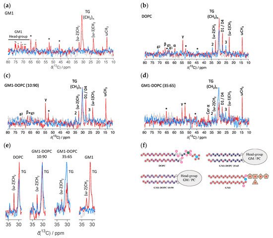 Figure 2 shows the PT ssNMR spectra for samples composed of GM1 and DOPC, as well as their mixtures (molar ratio of DOPC:GM1 = 90:10 and 65:35). In all figures, the individual DP (gray), CP (blue), and INEPT (red) spectra are overlaid and the different molecular segments are labeled according to Figure 1a,c. An asterisk (*) indicates the resonance lines originating from the MES buffer (Figure S1a). A dot (.) in the INEPT spectrum represents peaks originating from the oligosaccharide headgroups of the GM1 molecule. The crowded spectral region around 30.5 ppm is indicative of the acyl chain trans/gauche (TG) conformations, which is expected for a fluid bilayer phase. This can be distinguished from the all-trans (AT) conformation that would be expected for a solid (gel phase) bilayer, which gives rise to a peak centered around 33.5 (AT) ppm [42]. For a system with co-existing solid and fluid domains, one should expect to distinguish both AT and TG crowded spectra regions [42,45].