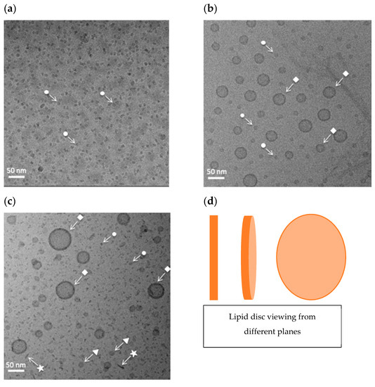 As a next step, we use cryo-TEM to image samples with the same composition as those studied with PTssNMR (Figure 3). The aqueous dispersions were rapidly frozen, thus providing information on the structure in solution. Additional images of the same samples are shown in Figure S3. In the sample that contains only GM1 in buffer, small and rather monodisperse objects are seen (white arrow with filled circle) (Figure 3a), interpreted as GM1 micelles in accordance with previous reports [46,47]. When GM1 is mixed with DOPC, the samples contain more than one type of structures, so unilamellar vesicles (the square symbol) co-exist with smaller objects that vary in size and shape depending on the GM1 content. In the sample that contains 10 mol % GM1 (Figure 3b), the vesicles co-exist with globular objects, similar to the micelles seen for the GM1 system (Figure 3a). At higher GM1 contents (DOPC-GM1 65:35, Figure 3c), the vesicles co-exist with polydisperse objects of varying size and shape. The smallest objects are similar to the micelles seen in the pure GM1 system, although they seem slightly distorted. The sample also contain slightly bigger objects that have both round (triangle symbol) and rod-like (star symbol) assemblies. The contrast of the round objects in the electron beam is rather homogenous across the object, without a high-contrast edge as is seen for the vesicles. The diameter of these round objects is similar to the length of the rods. Based on these observations, we propose that these rod-like and round structures originate from the same type of disc-like objects that are seen from different directions (Figure 3d). For the system composed of DOPC alone, it is well established that one can form unilamellar vesicles after the sonication of a lipid dispersion [48,49].