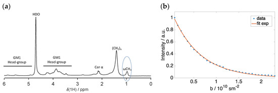 The GM1 micellar system was characterized using DLS, diffusion NMR, and SAXS. The scattering techniques DLS and SAXS provide information on particle size distribution, and through fitting of the SAXS data one can also obtain information on particle shape. The total lipid concentration varied a bit between these experiments for technical reasons (Table 1). From DLS studies on the GM1 micelles, we conclude that there is a rather monodisperse distribution of particle size, with a mean diameter of ca. 8 nm (Figure S4a). The size measurement from DLS is consistent with the finding from the cryo-TEM studies (Figure 3a). From 1H NMR self-diffusion experiments, we can further determine the average diffusion coefficient of ganglioside molecules in the aqueous solution, which in turn will depend on the size of the self-assembled GM1 aggregates. Figure 4 shows the 1H NMR spectrum of GM1 in pure water (Figure 4a) and the Stejskal-Tanner plot for the ωCH3 peak measured at various gradient strengths, where a solid line represents a single exponential fit to the experimental data points (Figure 4b). From this experiment, we obtain a diffusion coefficient (D) of 1.04 × 10−10 m2/s for the GM1 micelles (15 mM GM1 in buffer). Assuming that all GM1 molecules are present in the spherical micellar aggregates, the micelle diameter can be estimated at ~6‒7 nm using the Stokes-Einstein equation, , where R is the hydrodynamic radius, is the Boltzmann constant, T is the absolute temperature, and is the dynamic viscosity. This slight discrepancy between the results obtained by diffusion NMR and DLS results may be related to the differences in lipid concentration in the samples (Table 1). It is also noted that for a system with fast exchange, the measured diffusion coefficient is a weighted average of the diffusion of monomers and micelles, and there is a slight underestimation of the micelle diffusion (and size), as the analysis presented above does not account for the free monomers. However, we judge this effect to be rather small, as the critical micelle concentrations (CMC) of GM1 are very low (1–80 μM according to previous reports [52,53,54,55]).