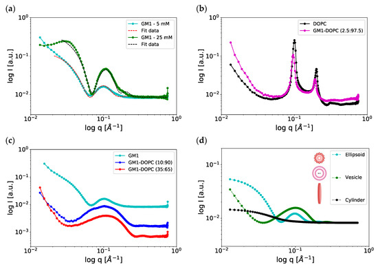 From the cryo-TEM studies (Figure 3), we know that DOPC-GM1 mixtures contain a number of different self-assembled structures. Figure 5b,c shows the SAXS spectra for DOPC-GM1 mixtures with varying GM1 contents. These experiments were also performed for samples with the same lipid composition but neutral pH, showing very similar results (Figure S5). The sample composed of DOPC with no added GM1 (Figure 5b—black curve) shows characteristic Bragg peaks, indicative of a lamellar phase with a repeat distance (d) of ~60 Å. This is in close agreement with previous reports for DOPC lamellar phase in pure water [57]. The addition of a small amount of GM1 (2.5 mol %) leads to a slight shift of Bragg reflections towards lower q values, implying an increase in the lamellar repeat distance to 64 Å (Figure 5b—magenta curve). This increase can be understood on the basis of the introduction of an anionic GM1 lipid into the bilayer, leading to both electrostatic repulsion and entropic repulsion between the bilayers. When the ganglioside content is further increased to 10 mol % (Figure 5c—blue curve), which corresponds to the sample in the cryo-TEM image in Figure 3b, the SAXS pattern is clearly altered and shows only one broad hump centered around q ≈ 0.1 Å−1, with a minimum at q ≈ 0.03 Å−1. This suggests spontaneous formation of smaller dispersed objects without detectable multilamellar structures. Further addition of GM1 to 35 mol % shifts the minimum and the broad hump slightly to higher q values (Figure 5c—red curve). This indicates polydispersity and a change in shape or size of the objects present in the system [46,56,58] We could not obtain a proper fit of these SAXS patterns using only a core-shell model for vesicle. From the cryo-TEM images in Figure 3, we know that these samples contain several different types of objects. These give rise to slightly different scattering patterns; some examples of the simulated data are illustrated in Figure 5d. In a sample with several different types of structures, we will have an overlay of these scattering patterns, and such fitting would have too many fitting parameters to be meaningful. Finally, the DLS measurements for these lipid mixtures show a broad size distribution, which is also consistent with the interpretation of co-existing structures in the sample (Figure S4b).