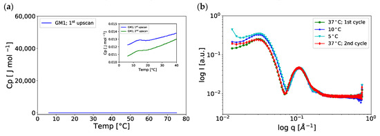 We now go back to the DSC data in Figure 7a, where a close inspection of the thermogram shows a low-enthalpy effect at ca. 14 °C (see figure inset). This bump is also seen at the same temperature in the second temperature upscan (Figure 7a—green curve). To further investigate this low-enthalpy temperature-induced change, we performed SAXS at temperatures above and below 14 °C. From the SAXS data in Figure 7b, we conclude that the characteristic minimum in the spectra measured at the lower temperatures (10 °C and 5 °C) is slightly shifted to higher q values as compared to spectra measured at 37 °C, indicating a small decrease in the size of the micellar objects when the temperature is reduced. This small-enthalpy change may be associated with conformational changes in the large oligosaccharide ganglioside headgroup moiety, as has previously been proposed by others [46]. To check the reversibility of these temperature-induced changes, the same sample was studied at 37 °C both before and after cooling to 5 °C (Figure 7b). The spectra of these samples were almost identical.
