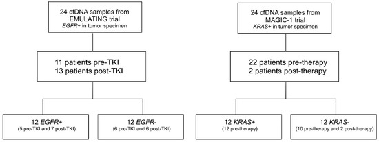 As described in Figure 1, among cfDNAs from EGFR-mutated patients, 11 were collected before TKI therapy (pre-TKI), whereas 13 were obtained during treatment (hereinafter referred to as post-TKI). Twelve cfDNAs carried the same EGFR mutation found in tumor tissue (EGFR+), whereas the remaining 12 samples were EGFR mutation negative (EGFR−). Regarding the 24 cfDNAs from KRAS-mutated patients, all samples were collected before the start of systemic treatment. As reported in Figure 1, 12 cfDNAs were KRAS+ and 12 were KRAS−.