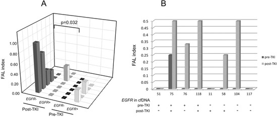 Loss of heterozygosity (LOH) frequency (fractional allelic loss (FAL) index). (A) EGFR mutation positive or negative cfDNA samples. p-Value was calculated using the Mann–Whitney test. (B) LOH frequency in pre- and post-tyrosine-kinase-inhibitor (TKI) matched samples.