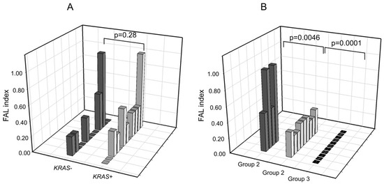 With regard to the KRAS-mutated cohort, no significant differences (p = 0.28) were observed between KRAS+ and KRAS− cfDNA samples, although KRAS+ samples exhibited a slightly higher alteration frequency (Figure 3A). Based on the number of alterations, samples could be arbitrarily stratified into three subgroups. Group 1 disclosed a high LOH pattern (median FAL index: 0.75), group 2 disclosed an intermediate LOH frequency (median FAL index: 0.33), and group 3 lacked detectable alterations at the analyzed markers (median FAL index: 0) (Figure 3B). Among these three groups, differences in the FAL index were significant, with p-values ranging from 0.0046 (group 1 vs. group 2) to 0.0001 (group 2 vs. group 3).