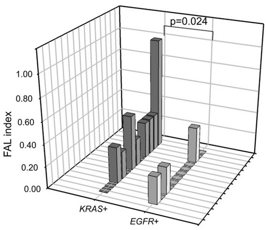 We next compared the LOH FAL index in EGFR+ and KRAS+ cfDNAs and found that KRAS+ samples had significantly more alterations than EGFR+ samples (p = 0.024) (Figure 4). On the contrary, no statistical significance was observed between EGFR− and KRAS− samples (p = 0.82), probably due to the relatively high LOH frequency of EGFR− compared with EGFR+ samples (Figure 2).