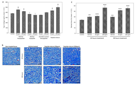 Further measurements of the effects on collagen expression were performed on the dermal fibroblasts. While each tested peptide and the peptides complex induced a slight increase in type I collagen expression, assessed by enzyme-linked immunosorbent assay (ELISA) analysis, the extent was as significant as expected (about a 1.3-fold increase in 200 ppm of peptides complex-treated cells) (Figure 2a). However, when collagen expression in dermal tissue was measured by Masson’s Trichrome staining after peptides complex treatment, a more significant increase was observed (Figure 2b). Through the image analysis using the ImageJ program, we calculated the stained area for each tissue, and about a 1.8-fold increase was observed in 200 ppm of the peptides complex-treated ex vivo tissue (Figure 2c).