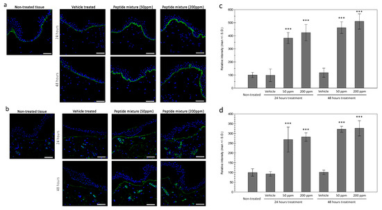 Expressions of collagen XVII and laminin in ex vivo skin tissue. Increased expressions of collagen XVII in the basal layer of the epidermis by tested peptide complex was observed by immunohistochemical staining (a). Dermal expression of laminin was also increased by peptide complex treated tissue (b). (bar = 100 mm). Fluorescence intensity analysis using ImageJ showed significant increases in both 24 and 48 h of treatment for collagen XVII (c) and laminin (d). (***: p < 0.001).