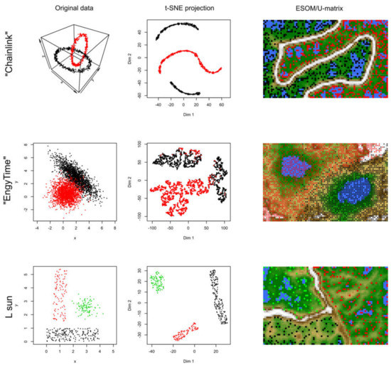 In contrast to t-SNE, the results obtained using the ESOM/U*-matrix approach were always correct (right column of panels in Figure 3). This method not only captures clusters separated by distances but also by data density, which explains why, in such situations, it outperforms t-SNE, which concentrates only on the first cluster property.