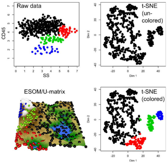 Results of a t-SNE analysis applied to data generated by a Gaussian mixture model with 4 modes derived from a FACS dataset (data set #6). The first panel in the upper left corner displays the original data. The projection obtained with t-SNE is shown at the second (not colored) and 4th (colored) panels. An alternative projection and subgroup detection technique, implemented as ESOM/U-matrix, is shown at the bottom left panel. The figure has been created based on the t-SNE analysis implemented in the R library “tsne” [3] and the U*-matrix was obtained using the R library “Umatrix” [4].