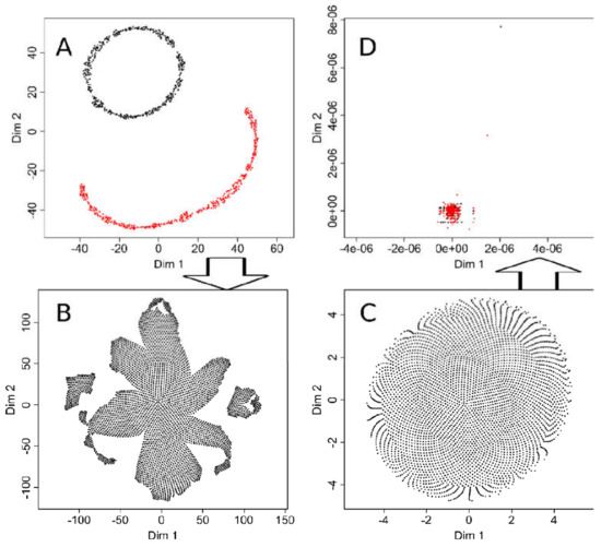 Certainly, t-SNE could also be tuned to obtain the correct result with the “golfball” data set, i.e., when the “perplexity” parameter was set to a high value of 2000 (Figure 7). However, the projection of the two-group “ChainLink” data set then became incorrect (Figure 7D). Hyperparameter tuning thus increases the performance of t-SNE, but it seems difficult to find adjustments that work on a completely different data set. So for effective tuning, the results must be known, which calls into question the use of this analytical method to find structures in unknown data sets. Therefore, demonstrations of results of t-SNE based on the default settings of the software implementations seem justified to point to related pitfalls in biomedical research.