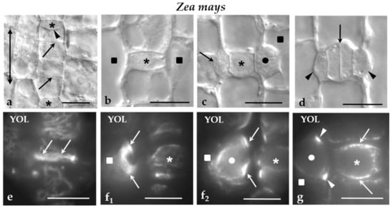 - Apostolakos, P.; Livanos, P.; Giannoutsou, E.; Panteris, E.; Galatis, B. The intracellular and intercellular cross-talk during subsidiary cell formation in Zea mays: Existing and novel components orchestrating cell polarization and asymmetric division. Ann. Bot. 2018, 122, 679–696. [Google Scholar] [CrossRef] [PubMed]