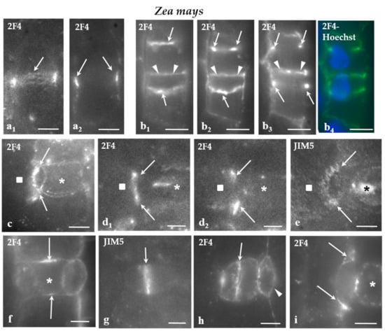 In Z. mays, the cell wall adjoining the PPB cortical zone in protodermal cells dividing symmetrically (Figure 2a1,2), those dividing asymmetrically to produce the GMCs (Figure 2b1–4), SMCs (Figure 2c–e), as well as symmetrically dividing GMCs (Figure 2f) was preferentially enriched by the 2F4- and JIM5-HG epitopes. The epitope accumulation was more intense in the cells dividing asymmetrically (Figure 2b–e). In SMCs, the JIM5 and 2F4 fluorescent cell wall region was located externally to the peculiar-in-shape PPB cortical zone (Figure 2c,d1,e; cf Figure 1f1 and Figure 2d2; cf. Figure 1f2,g). In all of these divisions, the daughter cell wall emitted JIM5 and 2F4 fluorescent signals (Figure 2g–i) that were more intense at their periphery.