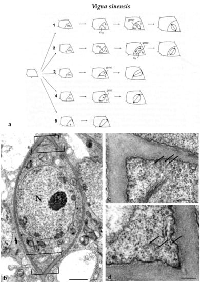 The ordinary protodermal cells of V. sinensis divided symmetrically in a plane usually aligned perpendicularly to the long cell axis as well as asymmetrically, initiating the process of stomatal complexes development. The latter was usually accomplished by one to three asymmetrical divisions and a symmetrical one that formed the guard cells (Figure 3a). The number and the plane of asymmetrical divisions involved in stomatal complexes development, which leads to the formation of either lens-like or triangular GMCs, are shown in Figure 3a. Regardless of their shape, the GMCs display a well-organized MT-PPB [14] (see also Figure 3b–d). The cell wall adjacent to the PPB cortical zone is thickened [14]. Well organized MT-PPBs foreshadow the sites of fusion of the daughter cell wall of symmetrical divisions of the protodermal cells as well of the asymmetrical ones involved in stomatal complexes development [14]. The plane of the symmetrical GMC division was parallel to that of the preceding asymmetrical division (Figure 3a).