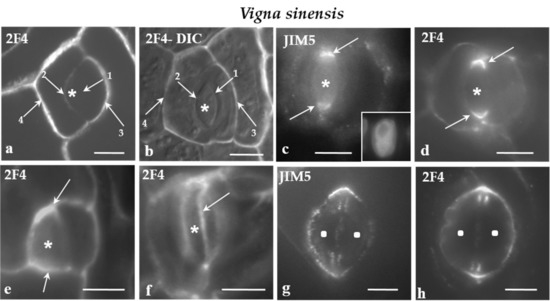 In V. sinensis, the JIM5 and 2F4-HG epitopes were preferentially accumulated along the whole anticlinal cell wall thickenings externally lining the PPB region in both lens-shaped and triangular GMCs (Figure 4c–e), as well as along the cell wall sites adjacent to the periclinal PPB regions (Figure 4f). The same epitopes were also traced in the daughter cell wall of the GMC division. Their presence was more intense at the periphery of the daughter cell wall (Figure 4g,h).