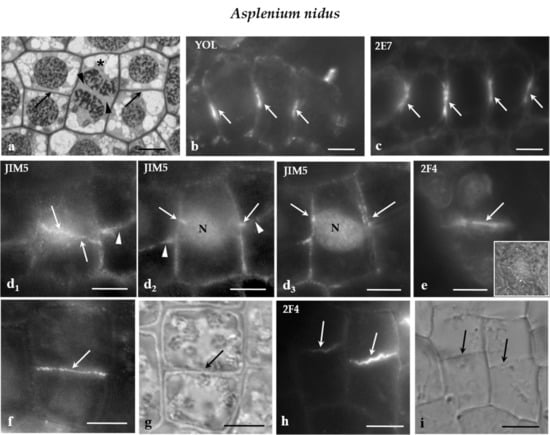 Regarding the involvement of the JIM5- and 2F4- HG epitopes in determining the plane of cell division of the examined cells, only hypotheses can be made. It is known that: (a) oligogalacturonide and other oligosaccharin molecules, derived from the breakdown of HGs and other materials of the cell wall matrix, function as signal transduction molecules and (b) oligosaccharides are generated in cell wall regions, where highly de-esterified HGs dominate (reviewed by [39,52]). Therefore, the JIM5- and 2F4- HG epitopes enriching the cell wall at the PPB region may participate in the transduction of hormonal stimuli involved in the determination of the cell division plane between neighboring cells, as in the case of A. nidus. It has already been suggested that HGs participate in the transduction of the auxin stimulus in the protoderm of Z. mays [24,43].