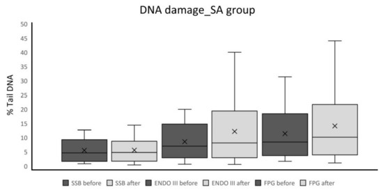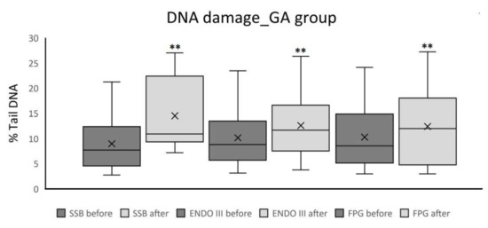 Slides were evaluated under a fluorescent microscope with an optical system (NIKON INSTRUMENTS INC., Melville, NY, USA). One hundred cells per slide were scored according to % tail DNA by the software LUCIA Comet Assay (Laboratory Imaging, Prague, Czech Republic). This means a total of 300 cells were analyzed per subject. The DNA analysis is expressed as the ratio of the DNA intensity in the tail relative to the head of the comet. The percentage tail DNA was determined for single-strand breaks in the DNA (SSB), pyrimidine damage (ENDO III), and purine damage (FPG). After evaluation, the slides were washed and allowed to dry.