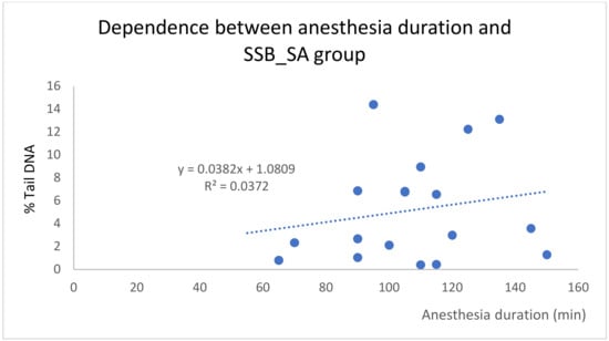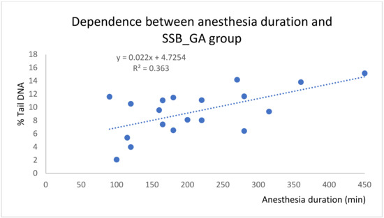 In our pilot study, two blood samples from each of the 40 patients were processed and the degree of DNA damage was evaluated by the comet assay method. The results showed a statistically significant increase in DNA damage in all three monitored parameters (SSB, and oxidized pyrimidine and purine bases) after surgery in the 20 patients undergoing general anesthesia. In the spinal anesthesia group, no statistically significant differences were found. This study has several limitations. We are aware that both groups of patients were disparate, in the type of surgery resulting from diagnosis, in that the surgery under general anesthesia required more time, and in that some patients underwent repeated surgery (for example, patients after polytrauma). Also, the age of the patients in both groups was statistically significantly different; the patients receiving spinal anesthesia being appreciably older. This was driven by the type of diagnosis, with older patients undergoing knee or hip replacement with total arthroplasty. Our results show that there is a linear dependence between the duration of general anesthesia and the level of single-strand breaks (Figure 3). This dependence has not been demonstrated in spinal anesthesia (Figure 4).