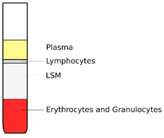 Four mL blood samples were obtained from patients before and immediately after the surgery into sodium citrate tubes and then were subjected to DNA damage analysis using the comet assay method previously described [39,40,41]. Briefly, blood was carefully laid over 4 mL LSM (Biotech, Austria) and tubes were centrifuged (30 min, 1500 rpm, 20 °C). The formed ring of lymphocytes (Figure 5) was transferred to centrifuge tubes (Sarstedt, Austria) and 10 mL of PBS (Sigma Aldrich, Saint Louis, MO, USA) was added. The concentration of cells in the sample was calculated using a Bürker chamber, and samples were centrifuged again (10 min, 1500 rpm, 8 °C). The sediment was re-suspended with PBS buffer (Sigma Aldrich, Saint Louis, MO, USA) and adjusted to a concentration of 1 million cells/mL.