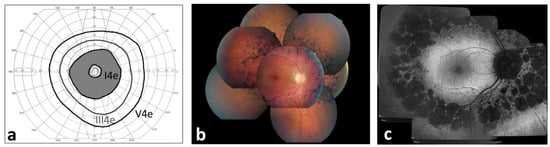 The medical records of the patients were taken at the Referral Center for Inherited Retinopathies of the Eye Clinic of the University of Campania ‘Luigi Vanvitelli’ from November 2006 to June 2019. The patients were enrolled for the study on the basis of their retinal phenotype. The inclusion criteria were: bone-spicule pigmentation or atrophy in the near mid-periphery (5–30 degrees) within and beyond the vascular arcades, corresponding to an annular scotoma, normal appearance of optic disk macula and far retinal periphery (Figure 1); and subnormal, yet recordable, full-field ERG responses. Patients with a medical history of hydroxychloroquine use were excluded, since the toxicity induced by hydroxychloroquine (Plaquenil) has been reported as a non-genetic cause of the pericentral RP phenotype [36].