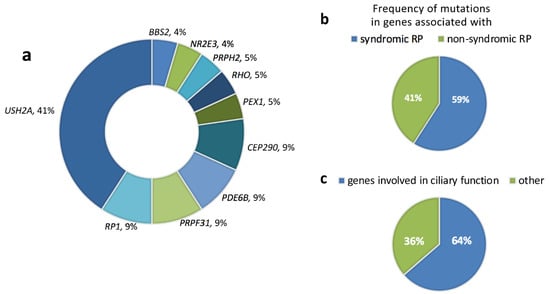 Intriguingly, almost two thirds of the solved cases of pericentral RP (i.e. 14 out of 22) harbored putatively pathogenic mutations in genes involved in ciliary development and function, such as BBS2 (one case), CEP290 (two cases), RP1 (two cases) and USH2A (nine cases) (Figure 2c).