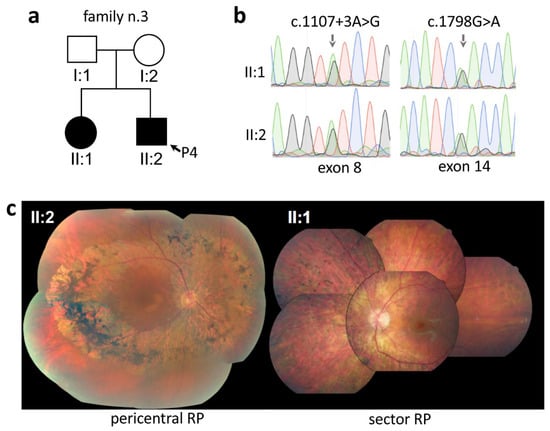 In the case of family n. 3, both offspring of unaffected parents were diagnosed with RP (Figure 3a). One of the siblings (II:2) was diagnosed with pericentral RP and was included in our cohort (P4; Table 1). This patient, at the age of 49, displayed as first symptoms a reduction of visual field, preserved BCVA (20/23 in both eyes), the typical pericentral retinal phenotype at the fundus examinations (II:2 in Figure 3c), constricted visual field with ring scotoma, and subnormal dark-adapted 0.01 and light-adapted ERG responses (Table S1). His affected sister, during a routine ophthalmological visit at the age of 57, showed a sector form of RP (i.e., bone-spicule localized in the nasal sector)(II:1 in Figure 3c) with preserved visual acuity (20/20 in both eyes), slightly constricted visual field, dark-adapted 0.01 ERG response below noise level, and subnormal light-adapted ERG responses. Both affected siblings were found to carry compound heterozygous pathogenic variants (c.1107 + 3A > G and c.1798G > A) in the PDE6B gene (Table 2, Figure 3b).