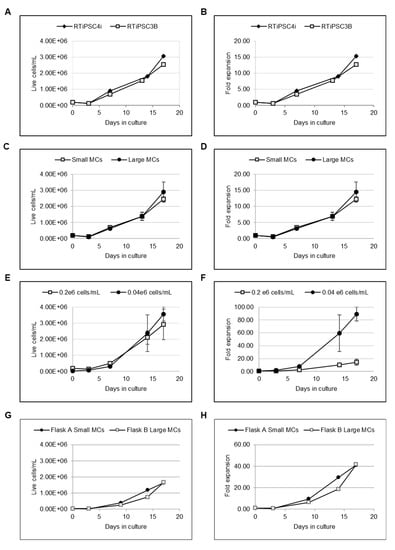 Given that MCs of larger diameters do not require custom manufacturing and have better availability, we tested whether the diameter of MCs impacts cell attachment and growth. Spinner flasks were inoculated with 0.2 × 106 cells/mL of RTiPSC3B in the presence of 90–150 µM (small) or 125–212 µM (large)-sized MCs coated with L7™ hPSC Matrix. Similar cell growth and expansion over 17 days was observed when using small and large-sized MCs. In both conditions, cells reached >2 × 106 cells/mL and >10-fold expansion on a similar day during culture (Figure 2C,D, respectively). These results validate the use of larger-sized MCs for cell expansion.