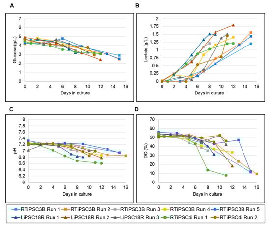 Since nutrient consumption and production of metabolites during expansion can inform us of the quality of expanded hiPSCs [17], we periodically measured key nutrients, such as glucose, and metabolites like lactate, during the runs. Figure 4A shows a decrease in glucose levels, corresponding to increased glucose consumption as the cells expand in culture. Glucose concentrations did not drop below 2.4 g/L, even when the cell density in the bioreactor reached 3.05 × 106 cells/mL (LiPSC18R Run 2). Conversely, lactate production increased with a maximum concentration of 1.79 g/L seen (Figure 4B, LiPSC18R Run 2). For the other cells lines, lactate levels did not exceed 1.6 g/L even for high cell densities of 5.6 × 106 cells/mL (RTiPSC3B) or 5.1 × 106 cells/mL (RTiPSC4i). Additionally, pH and dissolved oxygen (DO) were closely monitored in real time using the TruBio DV Software from Finesse Solutions. Similarly to the nutrient levels, the pH levels were affected by cell expansion. While the set point was 7.2, as cells expanded, pH levels dropped to ~6.8.