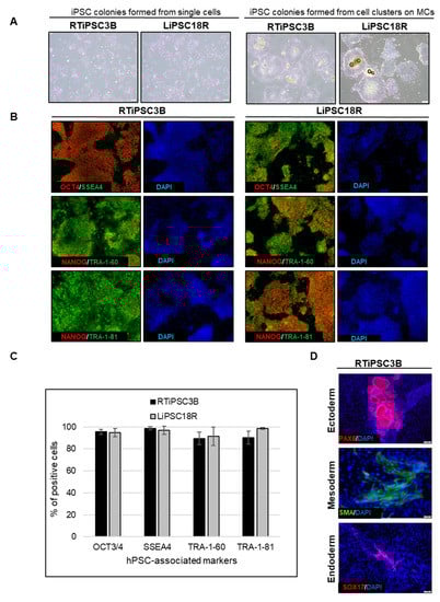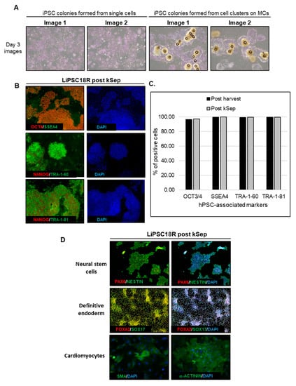 Cell harvest from the bioreactor was performed in a closed manner, inside the bioreactor. Medium was pumped out, and F3 non-enzymatic passaging solution was pumped in to release the cells from the microcarriers. As a result of this F3 passaging solution treatment, cells were released from the microcarriers as single cells. The resulting solution of single cells and microcarriers in this F3 passaging solution were then transferred in a closed manner through a separation bag to separate the cells from the microcarriers. The cells passed through the filter bag directly into a collection bag containing L7™ TFO2 hPSC media. In order to assess the quality of expanded hiPSCs post-harvest from a bioreactor, we characterized the cells for morphology, hPSC-associated markers, to validate their karyotype, and determine their pluripotency. To assess morphology, hiPSCs on MCs or MC-released hiPSCs were plated onto 2D cell culture plates coated with L7™ hPSC Matrix. Figure 5A (left panel) shows that RTiPSC3B and LiPSC18R cells, cultured in 2D culture plates after harvest from a 3 L bioreactor as single cells, attached well and grew as a monolayer with small colonies observed on day 3. Meanwhile, cell-MC clusters plated directly onto 2D culture plates without releasing the cells as single cells, exhibited typical hPSC colony morphology, including defined edges [23] and tightly packed cells with large nuclei and scant cytoplasm (Figure 5B, right panel) [1].