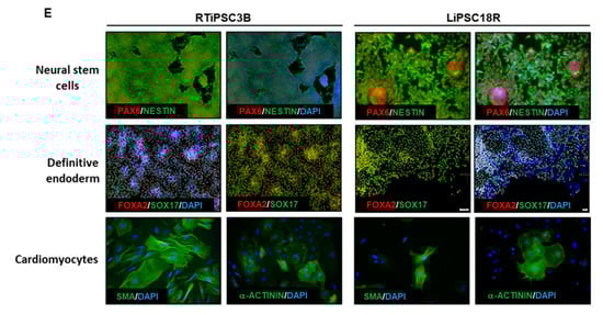 The potential of the expanded hiPSCs to differentiate into cells of the three germ layers was assessed either by embryoid body (EB) formation or by directed differentiation. Figure 5D shows immunofluorescence staining images of plated EBs formed from RTiPSC3B cells expanded in a 3 L bioreactor. Positive detection of germ layer-specific markers demonstrates that cells which expanded in a bioreactor retain their potential to give rise to cells of the three germ layers post-harvest. Directed differentiation of hiPSCs to definitive endoderm (DE, endoderm germ layer), neural stem cells (NSCs, ectoderm germ layer) and cardiomyocytes (CMs, mesoderm germ layer) was performed on RTiPSC3B and LiPSC18R cells after harvest from 3 L bioreactors. Immunostaining for germ-layer-specific markers confirmed that the expanded cells retained pluripotency and the capability to be directly differentiated to DE, NCSs and CMs (Figure 5E). As described in our Materials and Methods section, immunostaining for CM-specific markers was performed after observing spontaneous contraction.