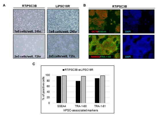 Quality assessments of the expanded hiPSCs post kSep included cell attachment, morphology, hPSC-associated marker expression, karyotype and pluripotency. Post kSep, single cell hiPSCs (RTiPSC3B and LiPSC18R cell line) were plated in two different cell densities on 2D cell culture plates coated with the L7™ hPSC Matrix. The cells, cultured in L7™ TFO2 medium, attached well and grew as a monolayer when 1 × 106 cells were seeded, while formation of small colonies were observed on day 3 when 2 × 105 cells were seeded (Figure 7A). Likewise, the cells expressed the hPSC markers as determined qualitatively by immunofluorescence staining and quantitatively by flow cytometry (Figure 7B,C, respectively).