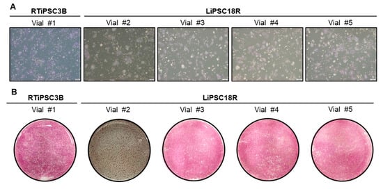 Quality of cryopreserved cells post thaw. (A) 6 × 105 cells from each vial were plated onto a well of a 6-well plate. Phase contrast images were taken 48–72 h post thaw. Magnification, 40×; (B) Cells were stained with AP staining kit three (vial #2) to five (all other vials) days post plating. Whole-well images are shown. Magnification, 1×.