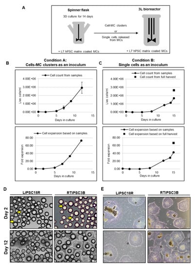 To demonstrate the feasibility of a 3D seed train, two conditions were tested: re-inoculation of cell-MC clusters from a spinner flask to a 3 L bioreactor (Condition A, LiPSC18R cells) and transfer of single cells harvested from a spinner flask to a 3 L bioreactor (Condition B, RTiPSC3B cells) (Figure 11A). In both conditions, cell density at inoculation was 0.04 × 106 cells/mL and cells were expanded with L7™ hPSC Matrix-coated MCs. Condition A resulted in a maximum cell density of 2.92 × 106 LiPSC18R cells/mL, corresponding to >70-fold expansion in 12 days (Figure 11B), which is comparable to our results in Figure 3. This finding suggests that cells from the original cell-MC clusters were released into the medium, either as a result of cell division or by physical forces (agitation, collision of microcarriers and cell-MC clusters), and they can attach and colonize the MCs devoid of hPSCs. Condition B resulted in ~70-fold expansion of RTiPSC3B cells on day 15, as determined by cell counts from a full harvest (Figure 11C), but, interestingly, exhibited a longer ‘lag phase’ that may be attributable to inoculating as single cells rather than cell clumps. Representative phase images of cell-MC clusters sampled from the bioreactor on day 2 and day 12 of the run, showing cell expansion (Figure 11D). Figure 11E shows formation of colonies with typical morphology from single cells or cell clusters expanded on MCs, five days after harvest and plating onto 2D culture plates.