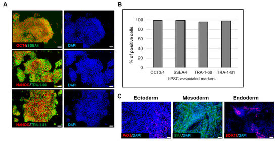 Cells cultured in 2D were fixed with 4% paraformaldehyde (Santa Cruz, SC 281692, Dallas, TX, USA) blocked with a blocking solution comprised of 10% donkey serum and 0.1% Triton X-100 in PBS −/−. The cells were incubated with primary antibodies followed by secondary antibody incubation and 4′,6-diamidino-2-phenylindole (DAPI) staining. Immunofluorescence was observed using an Olympus IX73 microscope. The following primary antibodies were used to detect hPSC-associated markers: OCT4/POU5F1 (Abcam, ab19857, Cambridge, UK), NANOG (R&D systems, AF1997, Minneapolis, MN, USA), TRA-1-81 (ReproCELL USA, Inc., 09-001, Beltsville, MD, USA), TRA-1-60 (Millipore, MAB4360, Burlington, MA, USA) and SSEA-4 (Millipore, MAB4304, Burlington, MA, USA). The following primary antibodies were used to detect expression of germ-layer specific markers: SOX17 (R&D systems, AF1924, Minneapolis, MN, USA), FOXA2 (Abcam, Ab108422, Cambridge, UK), NESTIN (R&D systems, MAB1259, Minneapolis, MN, USA), PAX6 (Biolegend, #901301), α-actinin (Sigma, A7811, St. Louis, MO, USA) and SMA (Millipore, CBL171, Burlington, MA, USA).