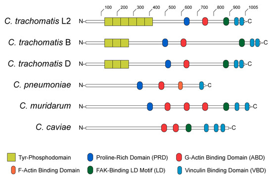 - Clifton, D.R.; Fields, K.A.; Grieshaber, S.S.; Dooley, C.A.; Fischer, E.R.; Mead, D.J.; Carabeo, R.A.; Hackstadt, T. A chlamydial type III translocated protein is tyrosine-phosphorylated at the site of entry and associated with recruitment of actin. Proc. Natl. Acad. Sci. USA 2004, 101, 10166–10171. [Google Scholar] [CrossRef]