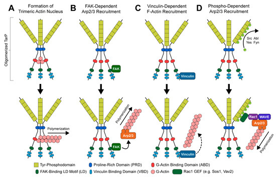 Mechanisms of TarP-directed actin modulation: (A) oligomerization-dependent formation of trimeric actin nucleus; (B) focal adhesion kinase (FAK)-dependent recruitment of the Arp2/3 complex; (C) vinculin-dependent recruitment of F-actin; (D) phosphorylation-dependent recruitment of an Arp2/3-activating protein complex.