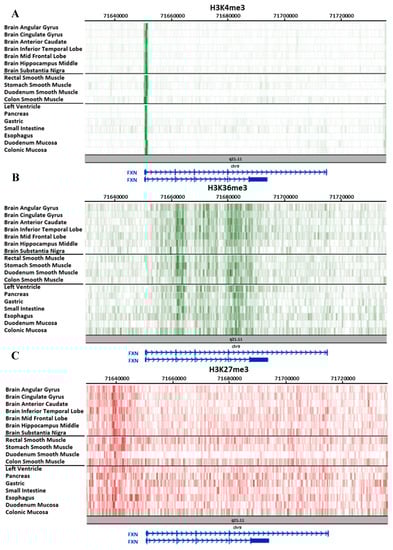 - Al-Mahdawi, S.; Pinto, R.M.; Ismail, O.; Varshney, D.; Lymperi, S.; Sandi, C.; Trabzuni, D.; Pook, M.A. The Friedreich ataxia GAA repeat expansion mutation induces comparable epigenetic changes in human and transgenic mouse brain and heart tissues. Hum. Mol. Genet. 2007, 17, 735–746. [Google Scholar] [CrossRef] [PubMed]