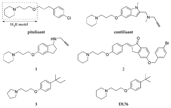 Histamine H3 receptors (H3Rs) are widely distributed in the human brain and dominantly in areas connected with cognition (such as the striatum, cortex, or hippocampus). H3Rs influence the release not only of histamine itself but also of other neurotransmitters, such as DA or acetylcholine [4], and increase the level of mentioned neurotransmitters in the synaptic cleft. Numerous pharmacological studies show that blocking H3Rs provides beneficial effects in the treatment of various neurological diseases such as narcolepsy, neurodegenerative diseases (e.g., Alzheimer’s disease and PD), attention deficit hyperactivity disorder, epilepsy, obesity, or neuropathic pain [5]. For years, many scientific centers and pharmaceutical companies have been involved in the search for active ligands of these receptors. Intensive synthetic work has led to a large number of structurally diverse compounds. Some of them have reached clinical trials, but so far, only one (pitolisant (Wakix®); Figure 2) has entered into the market as an orphan drug for narcolepsy [6].
