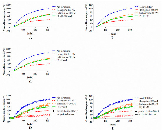 Reversibility of DL76 (A), 5 (B), 9 (C), and reference inhibitors without the preincubation and comparison of reversibility of 5 (D), 9 (E), and reference inhibitors that were (rings) or were not (lines) preincubated with hMAOB. Concentrations of compounds correspond to their IC80 values.