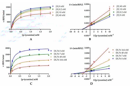 Michaelis–Menten curves for compound 9 (A) and DL76 (C): Inhibitors were tested in three concentrations (0.2 nM, 10 nM, and 40 nM for 9 and 7 nM, 48 nM, and 164 nM for DL76) representing their IC20, IC50, and IC80, respectively. Substrate (p-tyramine) was used in six concentrations: 0.05 mM, 0.1 mM, 0.5 mM, 1 mM, 1.5 mM, and 2 mM. (B,D) Double-reciprocal (Lineweaver–Burk) plots from enzyme kinetic studies.