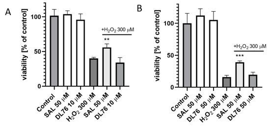 The effect of salsolinol (SAL) at 50 µM and DL76 at 10 µM (A) or at 50 µM (B) on SH-SY5Y neuroblastoma cells viability damaged by 300 μM of H2O2 after 24 h of incubation: Statistical significance was set at *** p < 0.001 and ** p < 0.01 by GraphPadPrism™ 8 software using one-way ANOVA and Bonferroni’s multiple comparison posttest in comparison with the positive control H2O2 (300 μM).