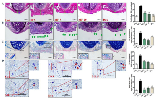 2.5. Effects of MF on Lung Histology and Mast Cell Migration in OVA-Induced AR Mice.